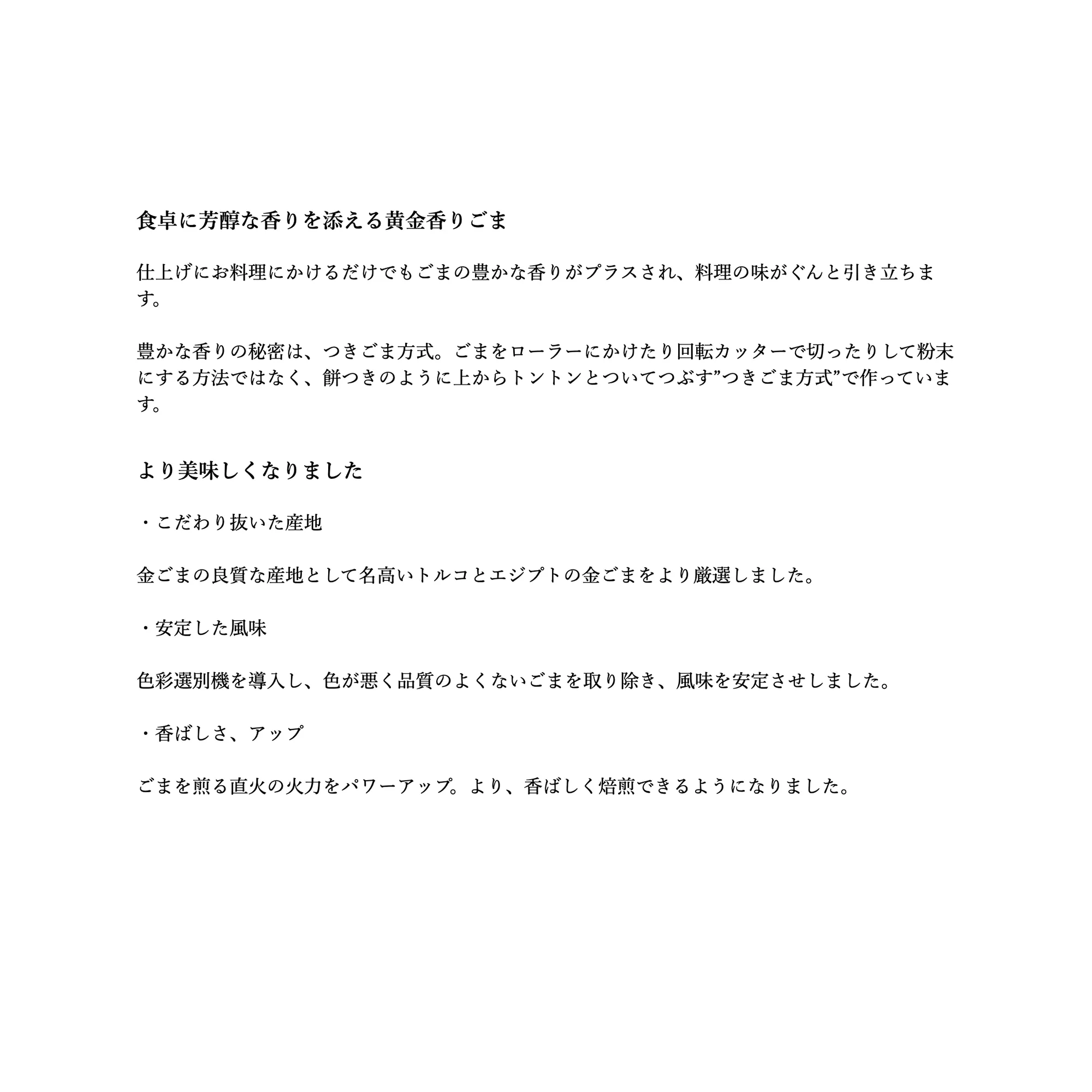 メディアでも話題!ごま専業メーカーより、焙煎職人が手がけた芳醇な香りのごま。 エーゲ海沿岸で育った素材を厳選。餅つきのようにトントンとついてつぶす、“つきごま方式”を採用。濃厚で香り高い美味しさを引き出しました。